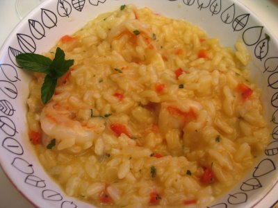 PREPARAZIONE: rosolare il riso con il burro e la buccia dell'arancia tritata. Bagnate con il vino e lasciatelo evaporare. Aggiungete poco alla volta il brodo necessario ben caldo. A metà cottura unite i gamberi sgusciati e dopo aver salato e pepato versare il succo di un'arancia.